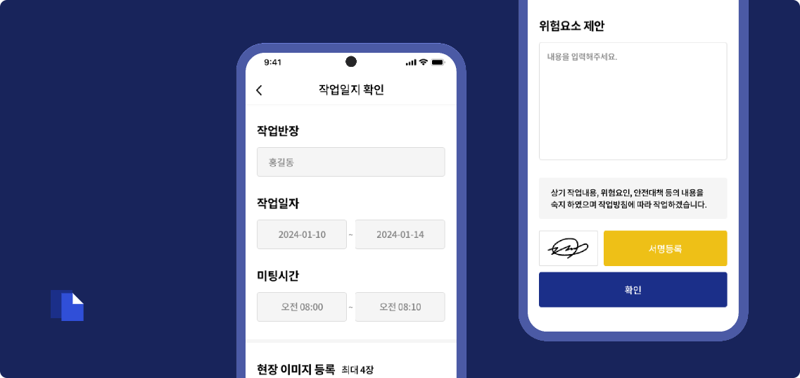 근로자와 현장관리자가 APP으로 핵심기능 수행하며